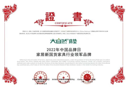 大自然床墊不負眾望,繼2020、2021年之后,第三次榮膺家居新國貨家具行業領軍品牌的稱號。