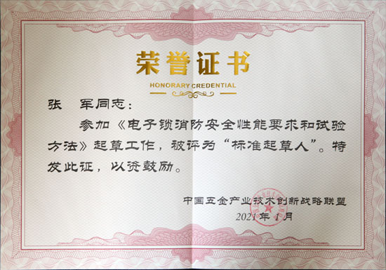 此次峰會對優(yōu)秀企業(yè)進(jìn)行了表彰,對獎項獲得者進(jìn)行了頒獎授牌等儀式。甌寶榮獲了《防火隔離設(shè)施用啟閉裝置通用技術(shù)條件》標(biāo)準(zhǔn)起草單位、《電子鎖消防安全性能要求和試驗(yàn)方法》標(biāo)準(zhǔn)起草單位的殊榮,甌寶董事長陳曉建先生榮獲《防火隔離設(shè)施用啟閉裝置通用技術(shù)條件》“標(biāo)準(zhǔn)起草人”,技術(shù)副總姜雷和實(shí)驗(yàn)室主任張軍榮獲《電子鎖消防安全性能要求和試驗(yàn)方法》“標(biāo)準(zhǔn)起草人”稱號,并登臺領(lǐng)獎。