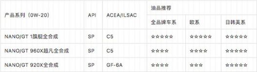1.NANO/GT 1 C5/SP 0W-20 旗艦級全合成機(jī)油; 2.NANO/GT 960X C5/SP 0W-20 超凡全合成機(jī)油; 3.NANO/GT 920X SP GF-6A 0W-20 全合成機(jī)油;
