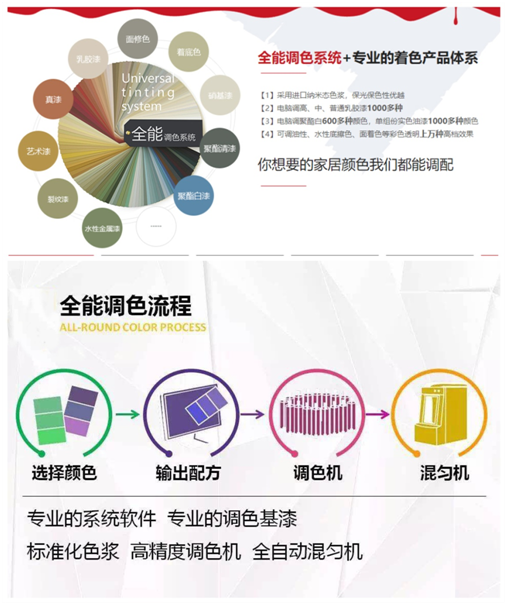 2000年,數(shù)碼彩正式推出了中國第一套集內(nèi)外墻乳膠漆、真漆、聚酯白漆、彩色透明面著色、底著色于一體的全能調(diào)色系統(tǒng),利用數(shù)字化電腦調(diào)色,可以調(diào)配出無數(shù)可能性的絢麗色彩,快速而準確地為客戶提供色彩搭配方案。