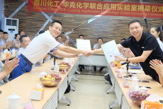 2017年6月,百川化工-畢克化學(xué)聯(lián)合實驗室(上圖)、百川化工創(chuàng)新技術(shù)專家委員會先后成立,PE木器涂料生產(chǎn)示范基地同期掛