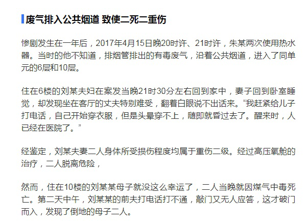 如果燃氣熱水器無法將煙道接觸室外,那就選擇電熱水器。因為燃氣一旦排入公共煙道,最后的結果是害人又害己。燃氣熱水器的排氣管的作用是為了排出熱水器中的廢氣。而公共煙道沒有排風的設備,并且存在一定倒灌的風險,如果溫度較高的情況下遇到油煙,就極有可能會發(fā)生爆炸。下面這一起案件的疏忽葬送了好幾個家庭,也害了自己的一生,千萬別拿燃氣熱水器的安裝不當回事。