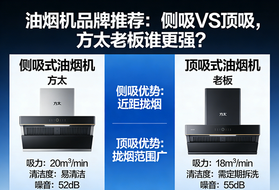 在現代廚房中,油煙機不僅是功能性家電,更是廚房美學的點睛之筆。面對市場上琳瑯滿目的品牌和型號,側吸式與頂吸式兩大技術流派的競爭尤為激烈。而作為國產廚電雙雄的方太與老板,憑借差異化的產品策略,各自占據著重要市場地位。本文將從技術性能、設計美學、使用場景等維度,深度解析兩大品牌的側吸與頂吸機型,助您精準決策。