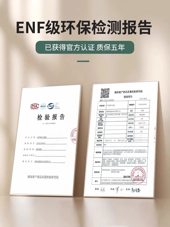 ·環保認證:ENF級安全守護板材環保標準達國家最高等級ENF 級(甲醛釋放量≤0.025mg/m3),經權威機構檢測認證,遠超國標E0級標準,即使在密閉空間也能保障室內空氣質量,讓家居生活更安心。