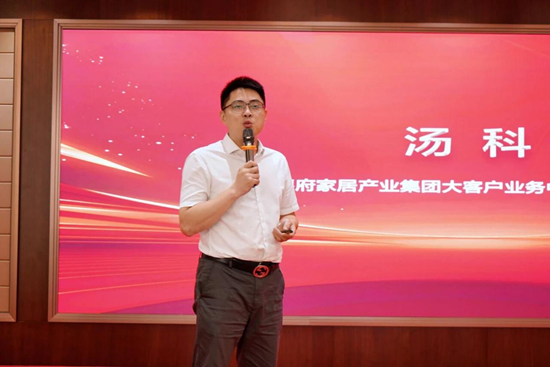 旺德府家居集團大客戶業務中心總經理湯科先生,圍繞政策與產品賦能體系進行詳細解讀。在闡述品牌及核心產品競爭優勢的同時,重點強調板材+輔材的產品推廣布局,明確以此助力品牌與合作伙伴共同開拓高端家居市場。