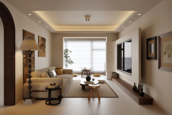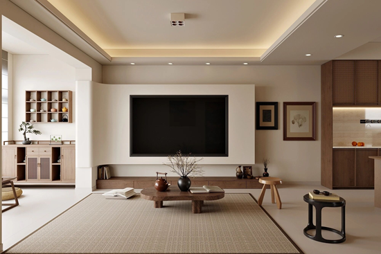 客廳電視柜:和墻面齊平的“懸浮式柜體”,把電視嵌入留白區,下方做木質地臺代替傳統電視柜,既藏了收納,又讓視覺輕盈不壓層高。