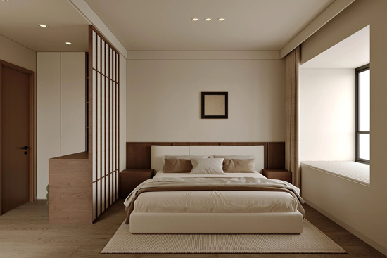 局部點睛:衣柜側邊用木質格柵屏風代替實墻,既做了空間分區,又用中古標志性的格柵元素,把風格“焊”在了細節里。