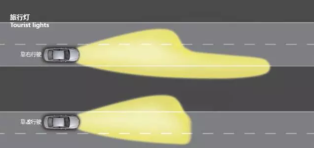 旅行燈是針對于當在靠右國家行駛的車輛進入靠左行駛的國家,需要對燈光進行調節,防止非對稱的近光燈造成對向車輛的眩目。對于配備矩陣式LED大燈的車型,當用戶激活后,近光燈中非對稱部分的LED燈會被關