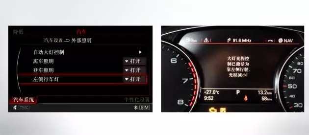 用戶可以在MMI上面激活左側行車燈,當激活后,每次打開點火開關或啟動后,儀表上面都會有文字提示: