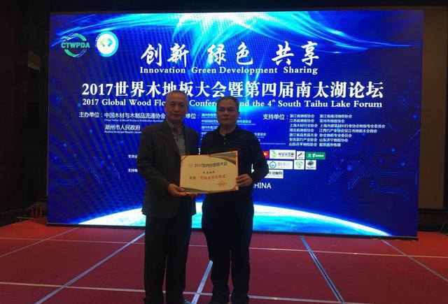 2017年11月1日,第四屆世界木地板大會暨南太湖論壇在湖州隆重召開,本次世界木地板大會由中國木材與木制品流通協會、湖州市人民政府共同主辦,同時也得到了數十家單位支持。中國木地板行業大咖悉數亮相會議現場,更有來自全球各地的專家及業界精英進行了深刻的行業演講。本次世界木地板大會不僅給同行之間帶來一次探討學習和交流的機會,而且也對多家著名木地板品牌頒發了獎項,歐曼地板在大會上被授予“無醛家居先驅者獎”。