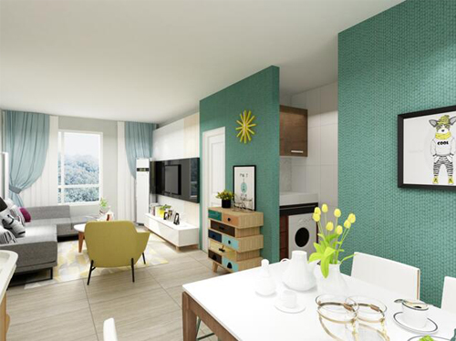 綠色是包容而靈活的,你可以用它大膽嘗試撞色的有趣,也可以用它點綴一切普通的搭配。綠色是一種很奇妙的顏色,它可以神秘而成熟,又能始終保持清新與活力。這款綠色系壁紙,設計師巧妙地運用撞色搭配技巧,以黃色太陽掛表、黃色與鏡像,以及黃色沙發椅等搭配,整個居室空間給人一種特別親近大自然,又特別充滿活力的感覺。
