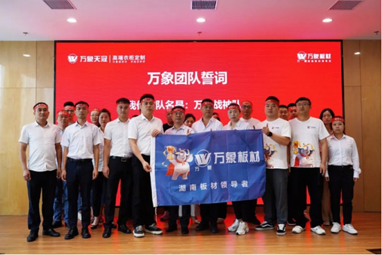 萬象建材公司總經理湯科先生帶領萬象板材品牌戰隊進行宣誓,旺德府家居產業集團輪值董事長劉偉先生授予象征團隊榮譽的沖刺戰旗。