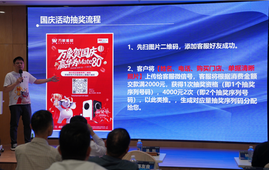 會上,湯科先生對“萬象賀國慶?贏華為 Mate80”線上抽獎活動的參與規(guī)則、時間節(jié)點等詳情政策進行了詳細宣講。同時,還針對本次會議專屬的多項重磅優(yōu)惠舉措展開解讀,為核心加盟商提供實實在在的合作支持。政策發(fā)布后,現(xiàn)場氛圍迅速升溫,咨詢與參與熱情顯著提升。最終,訂單數(shù)量遠超預(yù)期。