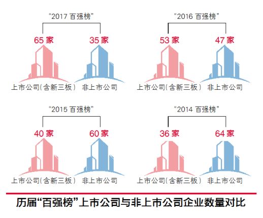 觀察以往四屆“百強榜”榜單可發現,上市公司(含新三板)與非上市公司上榜數量變化非常明顯。其中,上市公司(含新三板)從最開始的36家上升到65家,漲勢驚人;非上市公司從最開始的64家下降到35家,下滑明顯。
