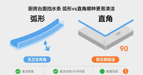 再看近年爆火的“弧形擋水條”,也被稱作“圓弧收邊”或“一體打磨邊”。它的精髓在于——沒有棱角!臺面與擋水條通過專業打磨,形成一道流暢的R角曲線(通常R≥5mm),水珠油污無處可藏,抹布一推到底,連衛生死角都“失業”了。